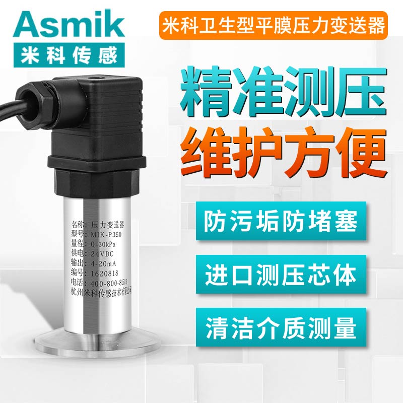 MIK-P350系列平面膜結(jié)構(gòu)壓力變送器選用德國進(jìn)口擴(kuò)散硅芯體,采用平面膜直接感受壓力。傳感器接口有卡箍式,M27×2,法蘭式可供選擇。輸出信號(hào)有電壓、電流、頻率信號(hào)等可選擇,傳感器平膜片防止了結(jié)垢,不衛(wèi)生及粘稠液體堵塞等問題。廣泛應(yīng)用于食品、醫(yī)藥、衛(wèi)生及釀酒工業(yè)等部門。