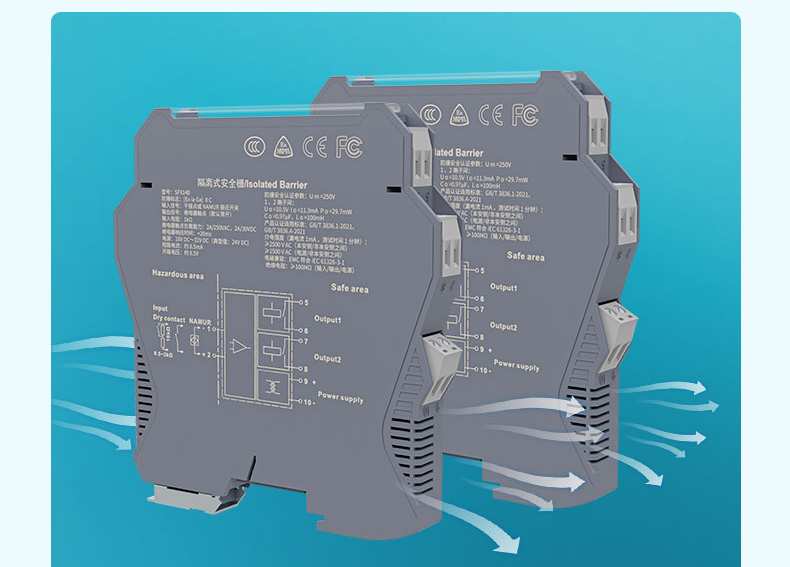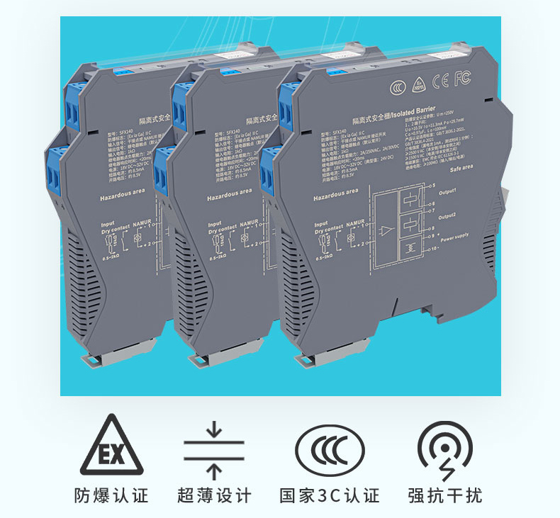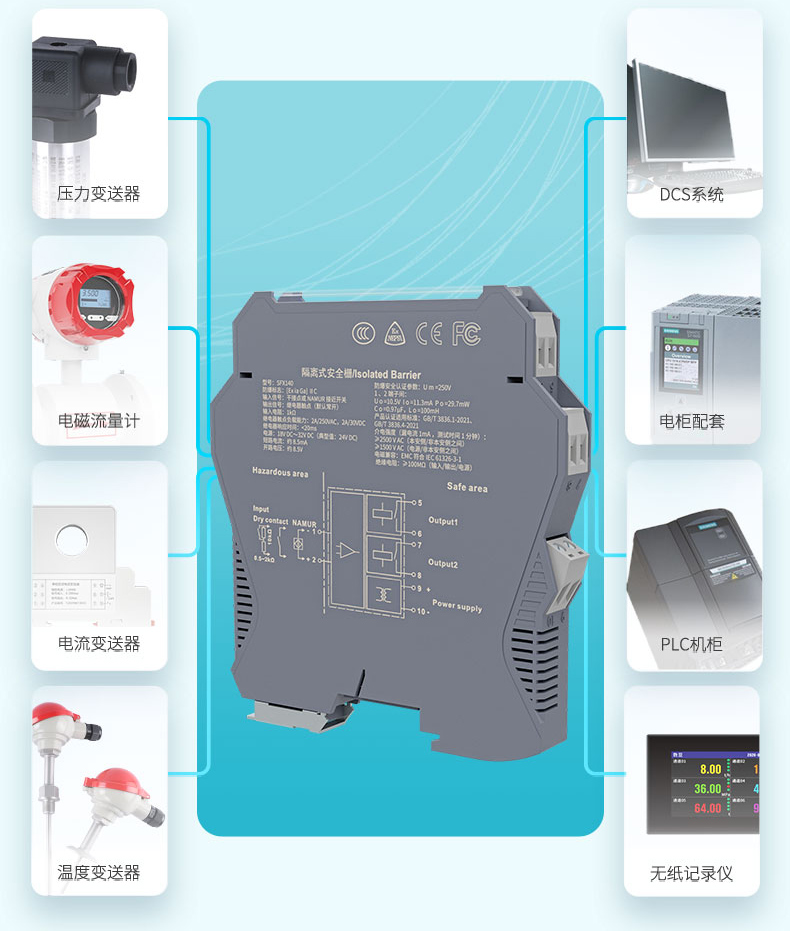 適用場合:本產(chǎn)品將來自危險區(qū)的開關(guān)量(干接點或接近開關(guān))信號,經(jīng)隔離轉(zhuǎn)換為繼電器觸點信號輸出到安全區(qū)。可通過撥碼開關(guān)設置輸入輸出正反相功能、第二路輸出功能(作為繼電器觸點輸出或作為故障信號輸出)及輸入線路監(jiān)測功能。輸入端、輸出端及電源端三端隔離。本產(chǎn)品為模擬化設計,具有可靠性高、響應快等諸多優(yōu)點??膳c各類儀表及 DCS、PLC 配套使用。