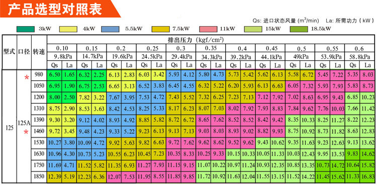 具體羅茨風(fēng)機參數(shù)選型表如下: